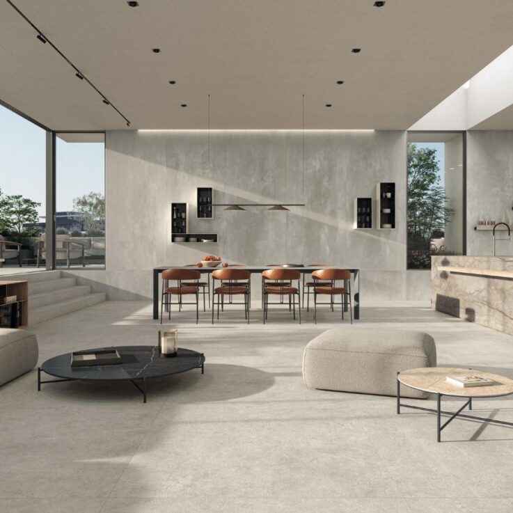 Boost Vision is a collection inspired by the principles of landscape design. A surface that blends the materiality of stone with the fluidity of concrete to create coherent, welcoming and versatile spaces designed for both indoor and outdoor use. The textures are designed to enhance residential, public and commercial environments with a contemporary aesthetic that combines functionality, nature and comfort. The range is completed by metal-effect decorations – Corten, Brass, Steel – which add depth, light and character to environments. The spaces are designed by PARK, a Milanese studio known for its integrated approach to architecture, context and materials. A shared vision that translates the landscape into a project.