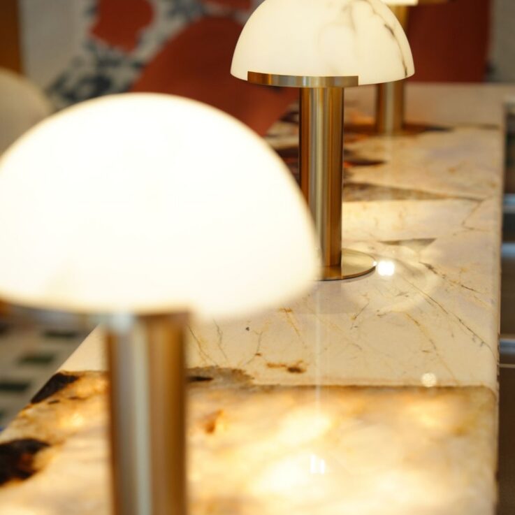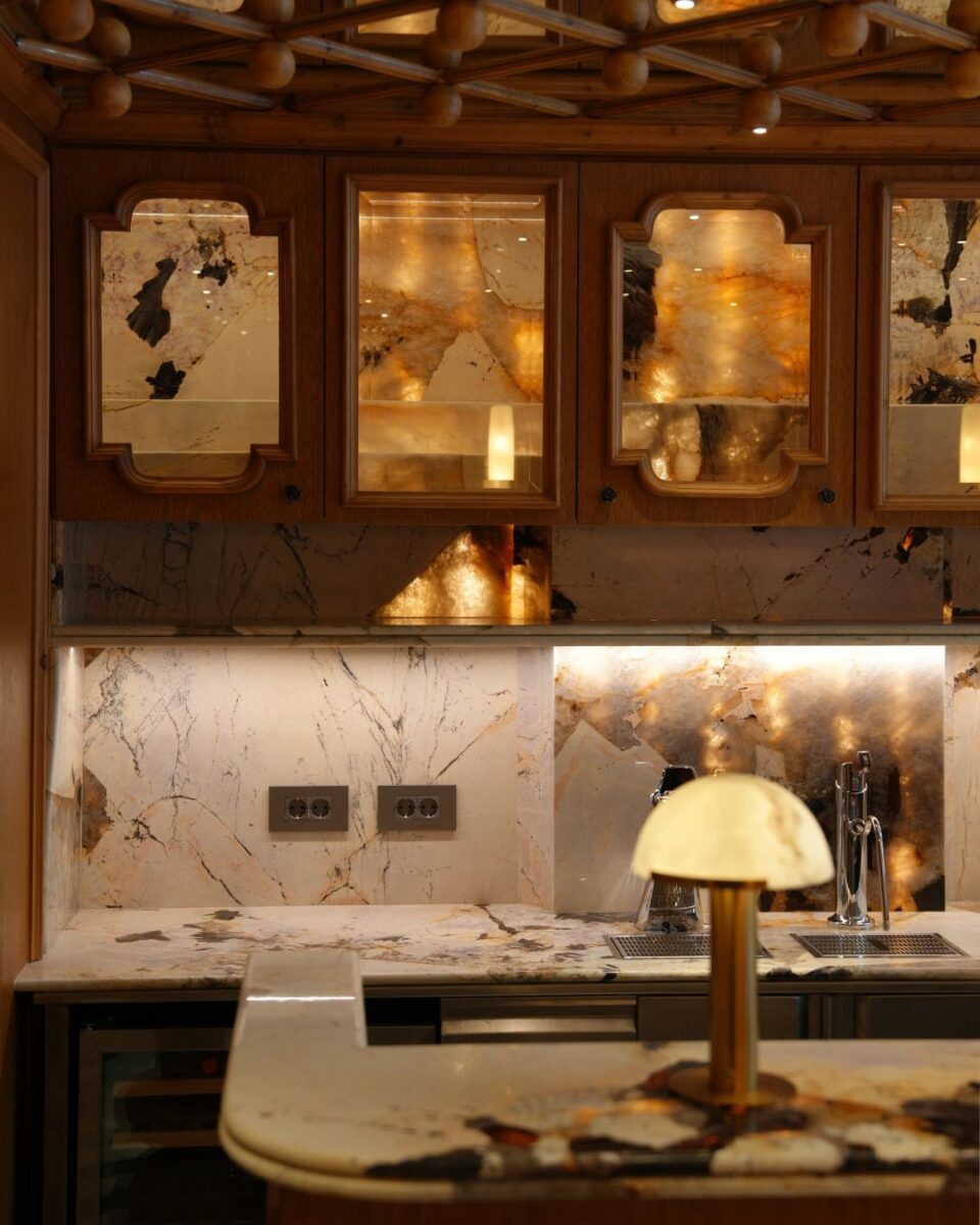 In Maison Dada’s Kitchen, Patagonia Marble transforms the countertop and backsplash into natural canvases. Its bold veining and mineral inclusions create a rhythm of movement that energizes the intimate wood-clad environment. Under soft lighting, the marble shifts in mood—from warm and inviting during the day to dramatic and jewel-like at night.