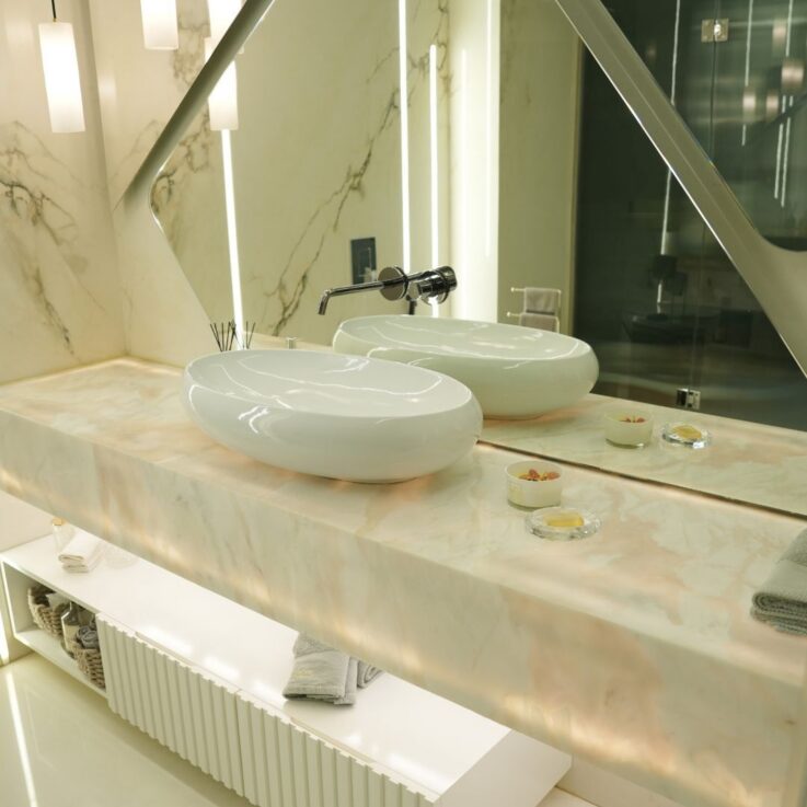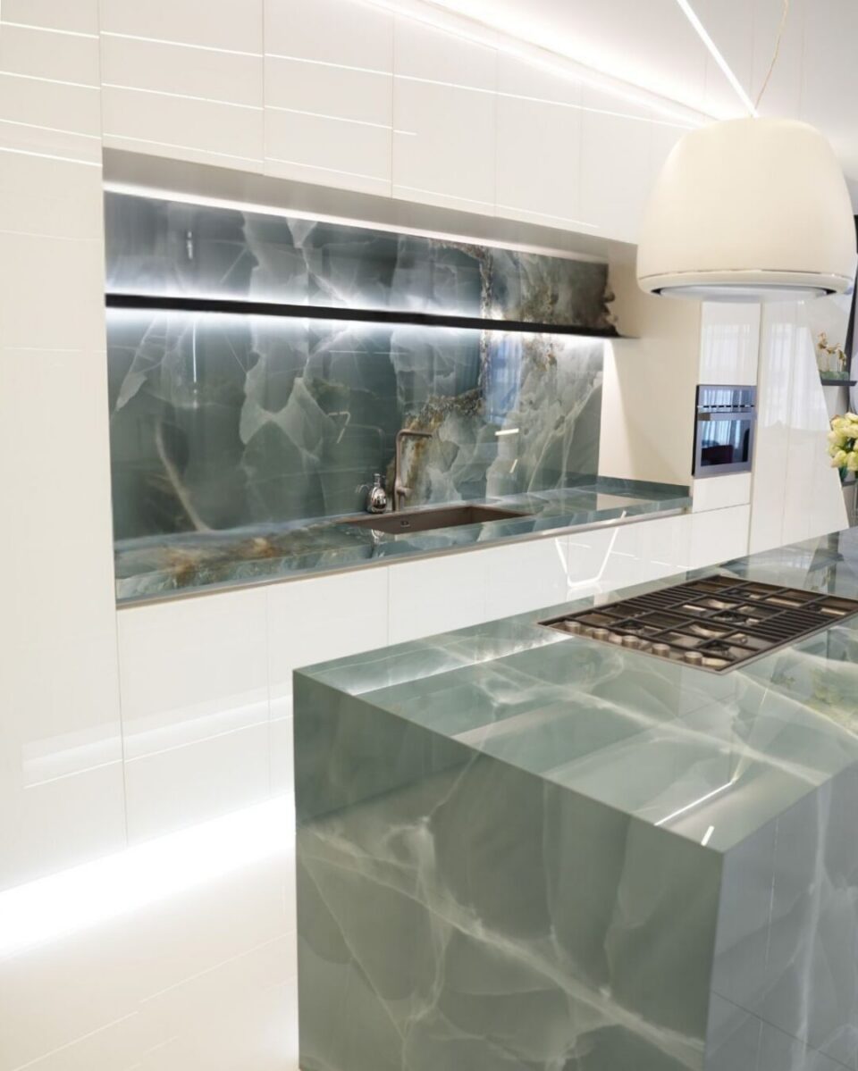 The journey starts in the kitchen, defined by the soft radiance of the Onyx porcelain slab. Its pale aqua tones blend into milky whites, while subtle crystalline veining adds movement without overwhelming the space. Under integrated lighting, the slab takes on a translucent glow, giving the kitchen a clean, refined, almost weightless presence.
