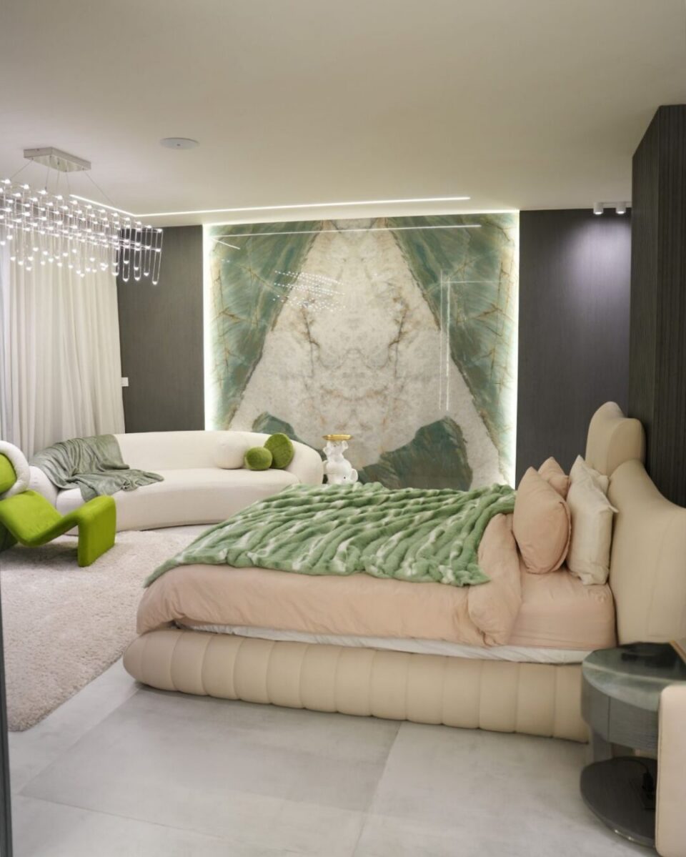 Across the project, each slab contributes a distinct aesthetic and emotional tone—from the calm glow of the kitchen to the artistic drama of the bedroom and the refined warmth of the living areas. Together, they create a unified, thoughtful interior that highlights the versatility and impact of high-end stone and porcelain surfaces.