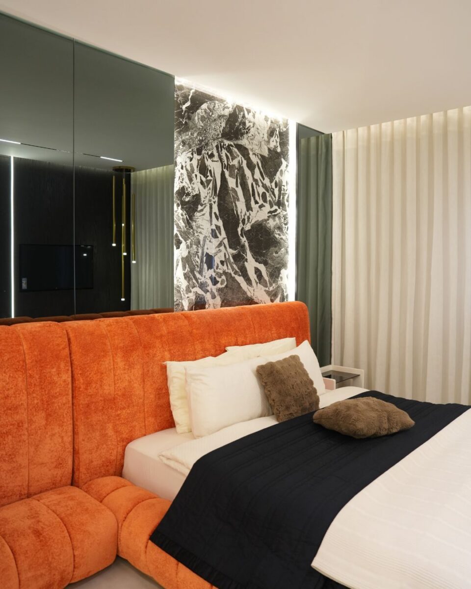 In the bedroom, the design shifts toward bold expression. The Exotic Wave porcelain slab, installed in a striking bookmatch, becomes the visual anchor. With its dynamic blend of charcoal, off-white, and smoky grey veins, it introduces energy and texture—almost like a natural artwork stretching across the wall. Nearby, the use of Nero Antico porcelain adds contrast. Its deep, dark base and fine mineral veining bring balance and depth, grounding the room with a calm and contemporary edge.