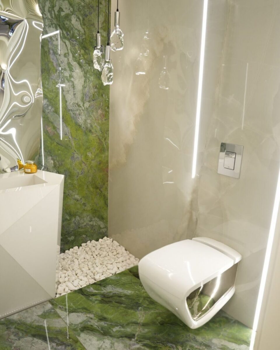 The design narrative concludes in the guest bathroom, where Connemarble Irish porcelain slabs introduce a fresh, earthy palette. Rich greens blend with hints of grey and stone-like patterns, creating an invigorating environment. The slab’s natural variation adds personality without overpowering the compact space, making it a visually memorable corner of the home.